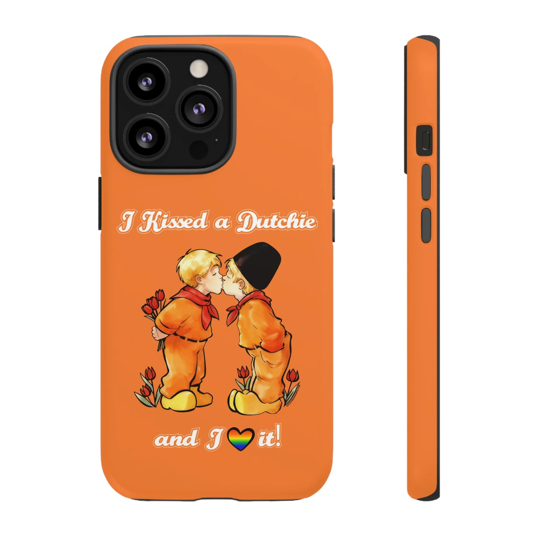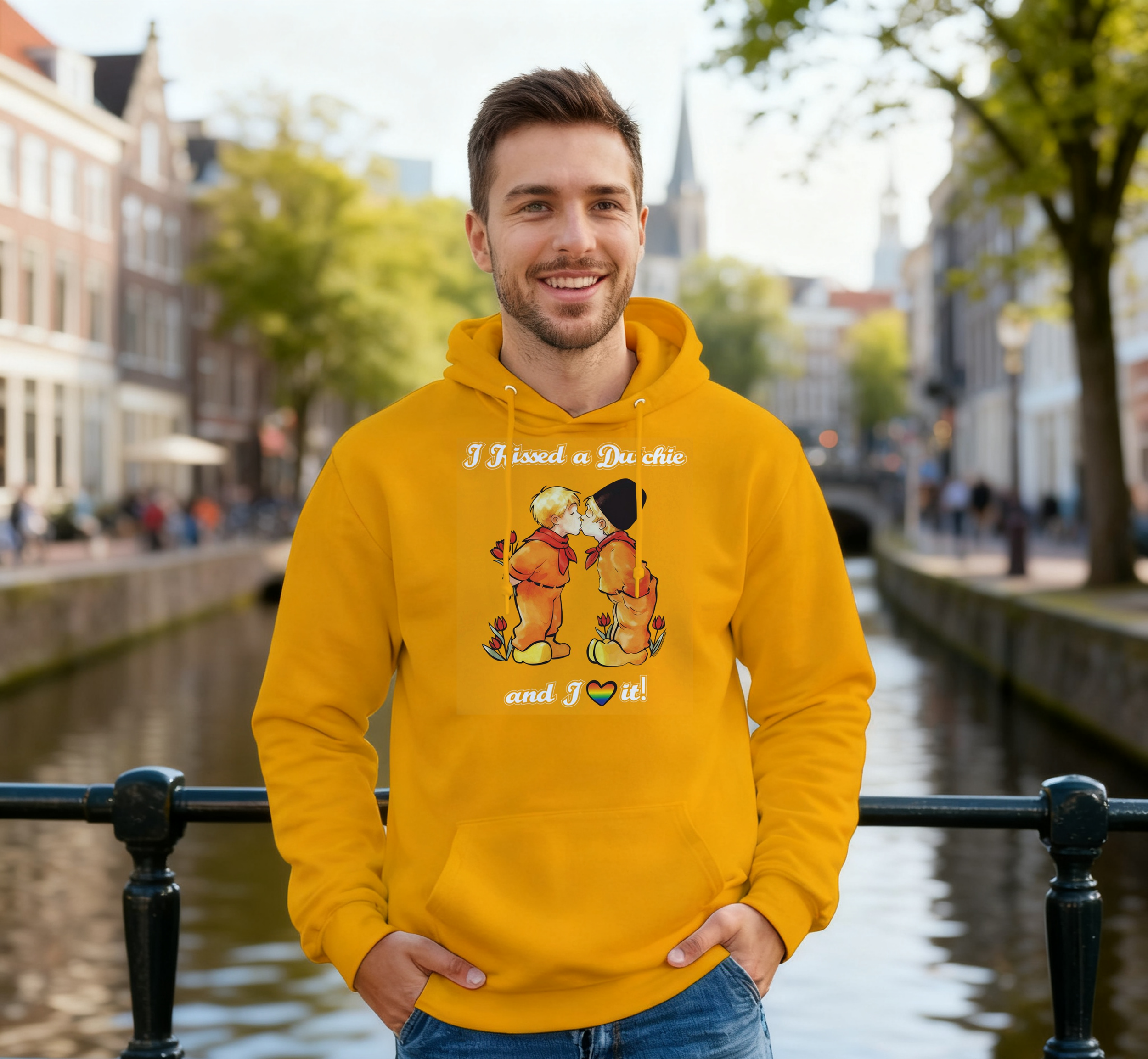 Celebrate love, Dutch style! This cheerful “I Kissed a Dutchie and I Loved It” T-shirt is the perfect statement piece for anyone with a Dutch partner or husband. Featuring a sweet Dutch gay couple kissing and warm Dutch orange tones, this shirt proudly celebrates love, diversity and LQBTQI+ love.