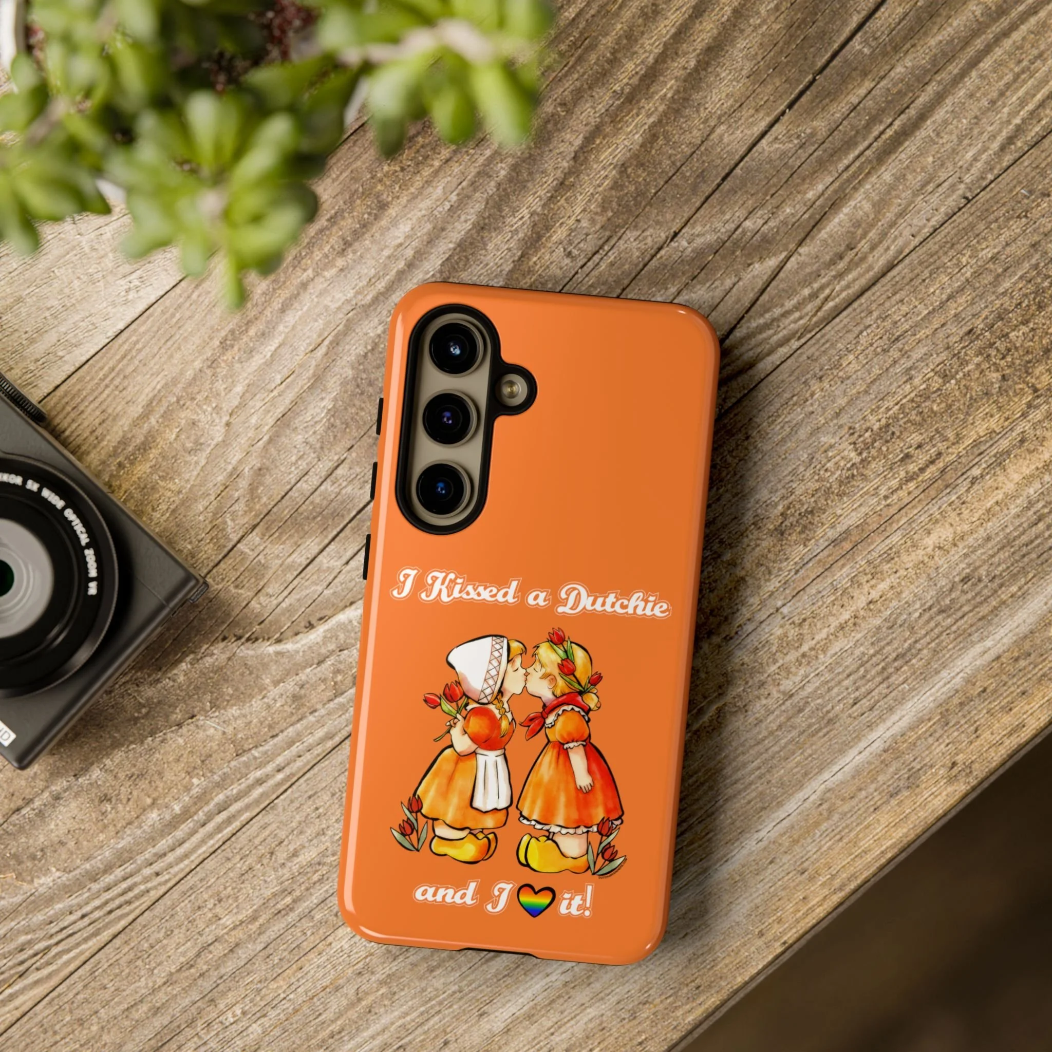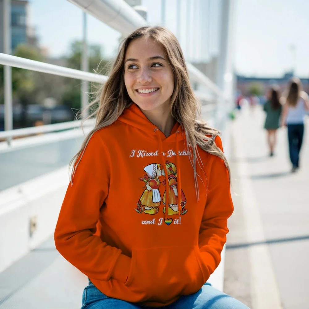 Celebrate love, Dutch style! This cheerful “I Kissed a Dutchie and I Loved It” T-shirt is the perfect statement piece for anyone with a Dutch partner or wife. Featuring a two Dutchies kissing and warm Dutch orange tones, this shirt proudly celebrates love, diversity and LQBTQI+ love.
